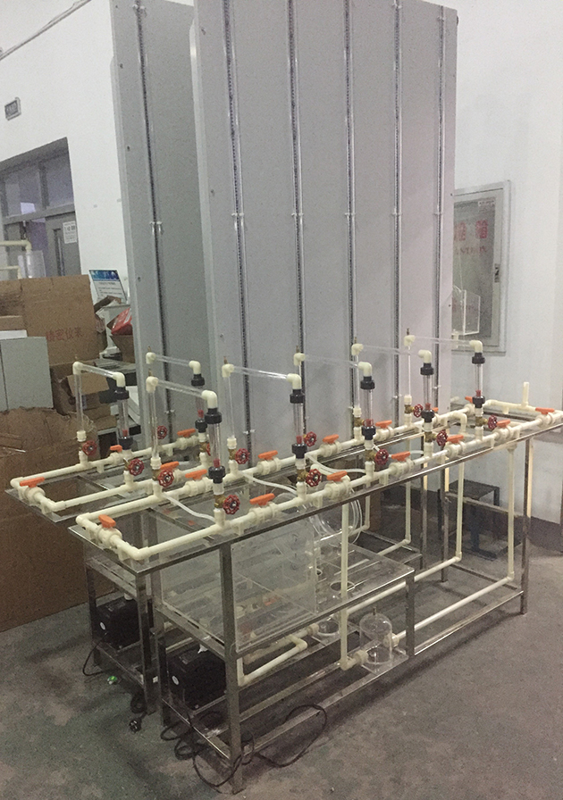 不銹鋼實(shí)驗(yàn)臺(tái)架、下半部由管道、閥門、流量計(jì)、穩(wěn)壓罐、鍋爐、水泵組成,用來(lái)模擬由5個(gè)用戶組成的熱水網(wǎng)路。上半部有高位水箱和安裝在一塊垂直木版上的12根玻璃管,玻璃管的頂端與大氣相通,玻璃管下端用膠管與網(wǎng)路分支點(diǎn)相接,用來(lái)測(cè)量熱網(wǎng)用戶連接點(diǎn)處的供水干管與回水干管的測(cè)壓管水頭(水壓曲線高度)。每組用戶的兩支玻璃管間附有標(biāo)尺以便直觀的讀出各點(diǎn)壓力。