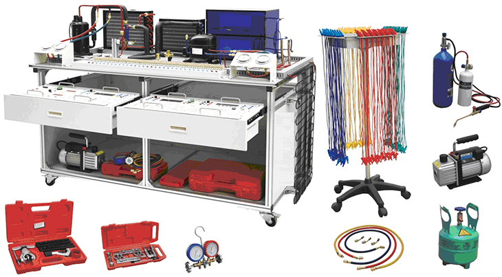 1、實訓臺采用鋁型材臺架加實訓模塊結構,裝置采用一體化設計,由導軌式鋁合金安裝平臺、空調(diào)系統(tǒng)、電冰箱系統(tǒng)、電氣控制系統(tǒng)等組成。底部安裝有四個帶剎車的腳輪,可以方便的移動和固定。設備配置空調(diào)制冷系統(tǒng)管路1套、直冷電冰箱制冷系統(tǒng)管路1套、安全插端子排,壓力表(1.5MPa)2只(3.5 MPa)2只等。