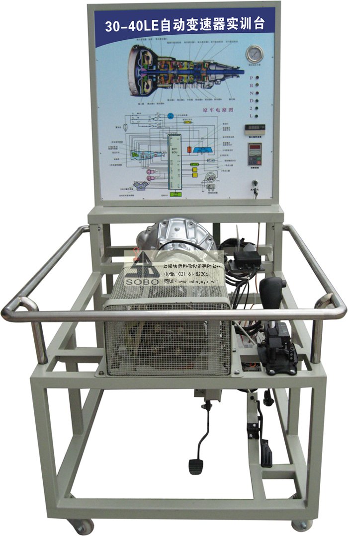 本變速器實訓臺是本公司采用豐田后驅(qū)A340E自動變速器為適應汽車教學需求而研制的,該實訓臺由電控變速器(八成新)、操作顯示面板及發(fā)動機彩色電氣原理圖電腦控制柜、可移動式臺架(萬向腳輪)、驅(qū)動系統(tǒng)(腳踏式油門踏板)變頻電機驅(qū)動、啟動系統(tǒng)(電門鎖方式啟動)、車速傳感器、電磁閥執(zhí)行器、原車電腦、具有發(fā)動機運轉(zhuǎn)及顯示(轉(zhuǎn)速.車速.檔位)、液壓油壓力顯示表(顯示換檔過程油壓)、自動變速器電磁閥工作指示LED燈、故障設(shè)置區(qū)可設(shè)置12路故障(老師設(shè)置任一路線路故障)、故障排除區(qū)(學生通過各種儀器、儀表、)在面板上用專用排故線連接排除故障、傳感器信號模擬等多項功能、具結(jié)構(gòu)緊湊、操作方便、安全可靠、教學直觀、是汽車自動變速器實物教學不可缺少的實驗室設(shè)備之一。