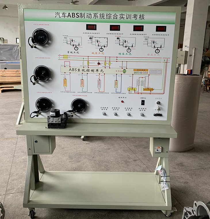 ABS控制單元、ABS電磁閥總成、輪速傳感器、制動(dòng)開關(guān)等。檢測端子、故障設(shè)置系統(tǒng)、大容量蓄電池或12V開關(guān)電源、大型彩色噴繪電路原理圖、控制面板、可移動(dòng)臺(tái)架、使用說明書及任務(wù)驅(qū)動(dòng)式實(shí)訓(xùn)指導(dǎo)書等。