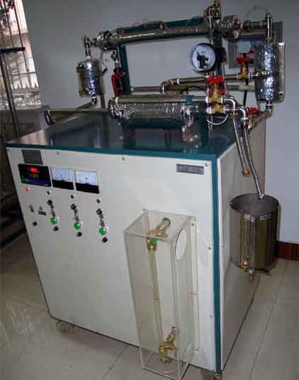 電蒸汽鍋爐、套管換熱器、蒸汽冷凝罐、蒸汽及水流量測試設(shè)備、加熱由固體調(diào)壓模塊無級調(diào)節(jié),由多路巡檢儀顯示的溫度測試系統(tǒng),不銹鋼臺架及控制屏等。