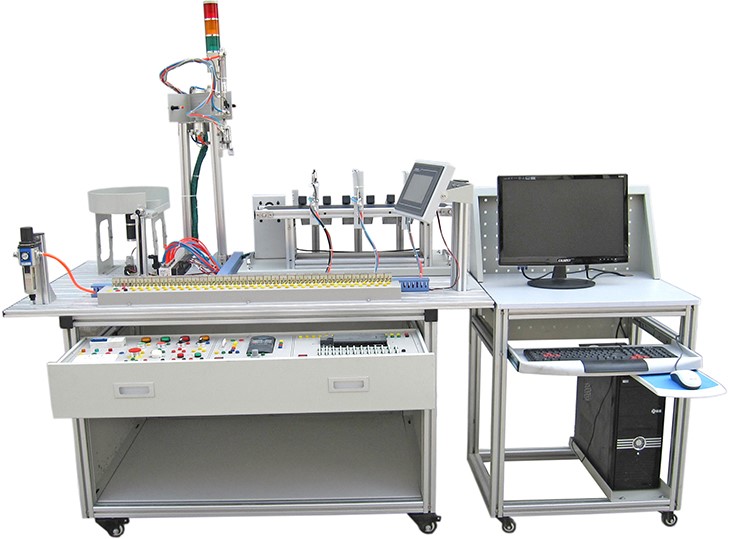 模塊、變頻器模塊、按鈕模塊、電源模塊、模擬生產(chǎn)設(shè)備實訓(xùn)模塊(包含上料單元、皮帶輸送檢測單元、氣動機械手搬運單元、物料傳送倉儲單元)、觸摸屏、接線端子排和各種傳感器等組成。采用開放式和拆裝式結(jié)構(gòu),可根據(jù)現(xiàn)有的機械部件組裝生產(chǎn)設(shè)備,使整個裝置能夠靈活的按實訓(xùn)教學(xué)或競賽要求組裝具有生產(chǎn)功能的光機電一體化設(shè)備。模塊采用工業(yè)標(biāo)準(zhǔn)結(jié)構(gòu)及抽屜式模塊放置架,互換性強。
