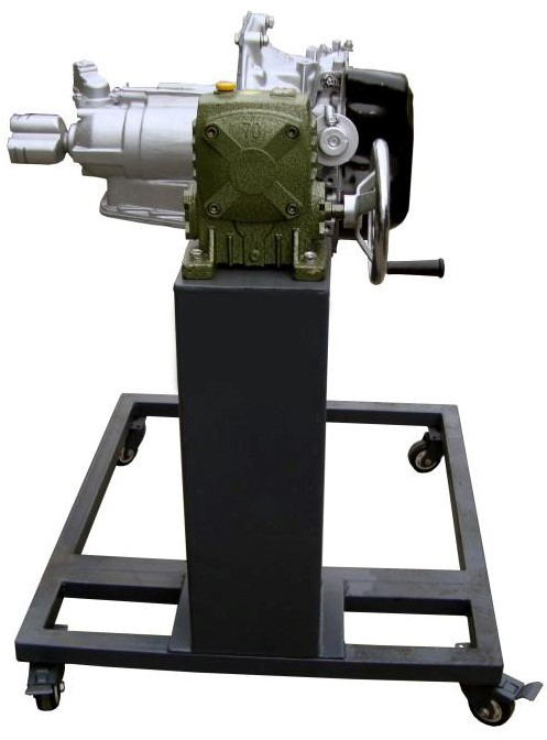 采用減速翻轉(zhuǎn)機構,可使變速器旋轉(zhuǎn)任意角度,并能任意位置鎖止,便于學生從不同的角度進行拆卸和裝配。