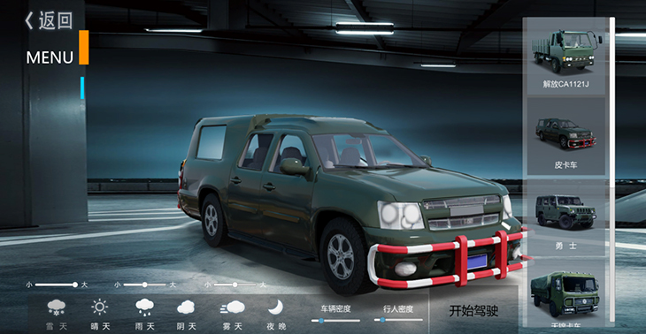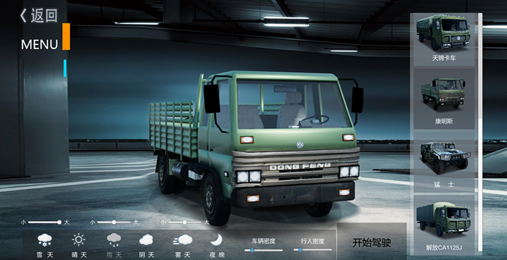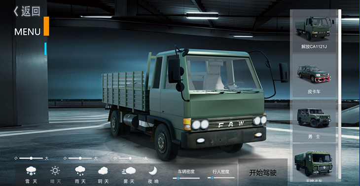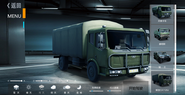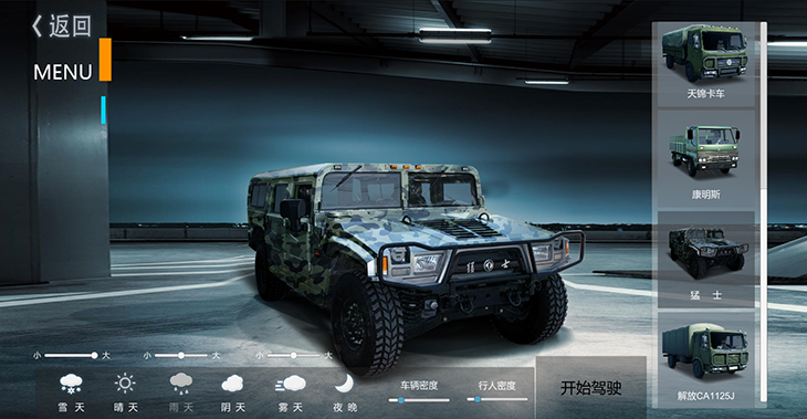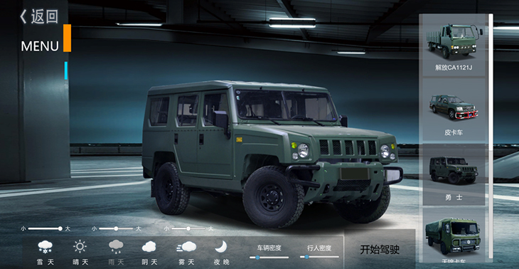 7.1、仿真車模型:10 種典型虛擬車輛模型:東風猛士、北汽勇士、 EQ1118、EQ1121、 EQ2102、SX2150、SX2190、豪濼 ZZ2197、東風天錦、大客車等,并可根據需要拓展、定制個 性化車輛模型。