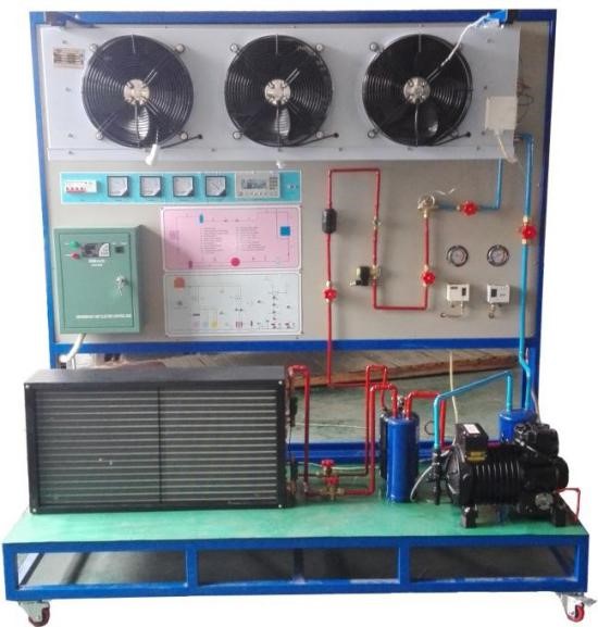 工業(yè)制冷系統(tǒng)實訓(xùn)考核裝置主要由半封閉式制冷壓縮機、冷凝器、蒸發(fā)器、膨脹閥和故障設(shè)置開關(guān)、測試儀表等組成。實訓(xùn)臺通過手閥開關(guān)和鈕子開關(guān)分別來設(shè)置管路系統(tǒng)和電控系統(tǒng)的 20 多種故障。設(shè)備采用先進的電控系統(tǒng)并具有具有開相,缺相, 過流等保護功能。蒸發(fā)器風(fēng)扇采用變頻器控制速度。配備 8 路溫度計,電壓表,電流表,功率表,功率因數(shù)表和壓力表,能實時觀察運行參數(shù)