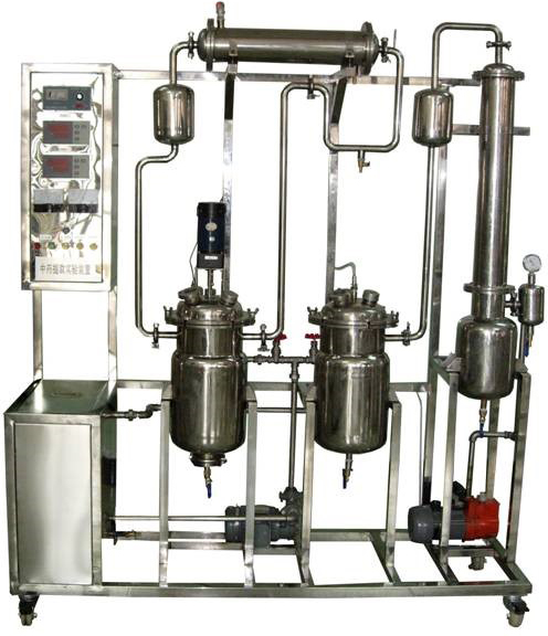 中藥提取實(shí)驗(yàn)裝置由提取罐、蒸發(fā)器、攪拌電機(jī)、列管式加熱器、冷凝器、油分器、收油器、藥液泵、貯液罐、過濾器、真空泵、調(diào)速器、數(shù)顯溫度儀、不銹鋼框架、控制屏等組成。提取罐、蒸發(fā)器配導(dǎo)熱油加熱系統(tǒng),提取罐、蒸發(fā)器頂部蒸汽出口均設(shè)置了除沫器。
