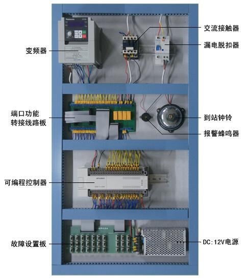 3.電氣控制部分:電源空氣開關(漏電脫扣器)、DC12V驅(qū)動電源、PLC可編程控制器、接線端口電路板、到站鐘等。