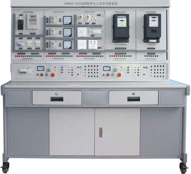 電氣安裝與維修實訓(xùn)考核裝置是根據(jù)工廠電氣安裝和室內(nèi)電氣安裝等維修 電工和電氣安裝工實訓(xùn)鑒定要求開發(fā)的一種通用實訓(xùn)平臺。 適合于各類職業(yè)院校 和技工學(xué)校維修電工、 電氣安裝工、水電工等有電氣實訓(xùn)要求的相關(guān)專業(yè)的作為 公共實訓(xùn)平臺使用。 采用鋼制網(wǎng)孔板和鋼制專用型材組接而成,安裝有自鎖式腳輪,方便移動和使用。裝 置表面噴塑,色彩穩(wěn)重氣派。電氣安裝與維修實訓(xùn)裝置設(shè)計高度以人站在一級人字梯即可方便操作的高度,既安 全又能使使用者感受到施工現(xiàn)場環(huán)境。 橫向、 叢向?qū)挾群线m, 可以模擬現(xiàn)場線路的轉(zhuǎn)向布置。